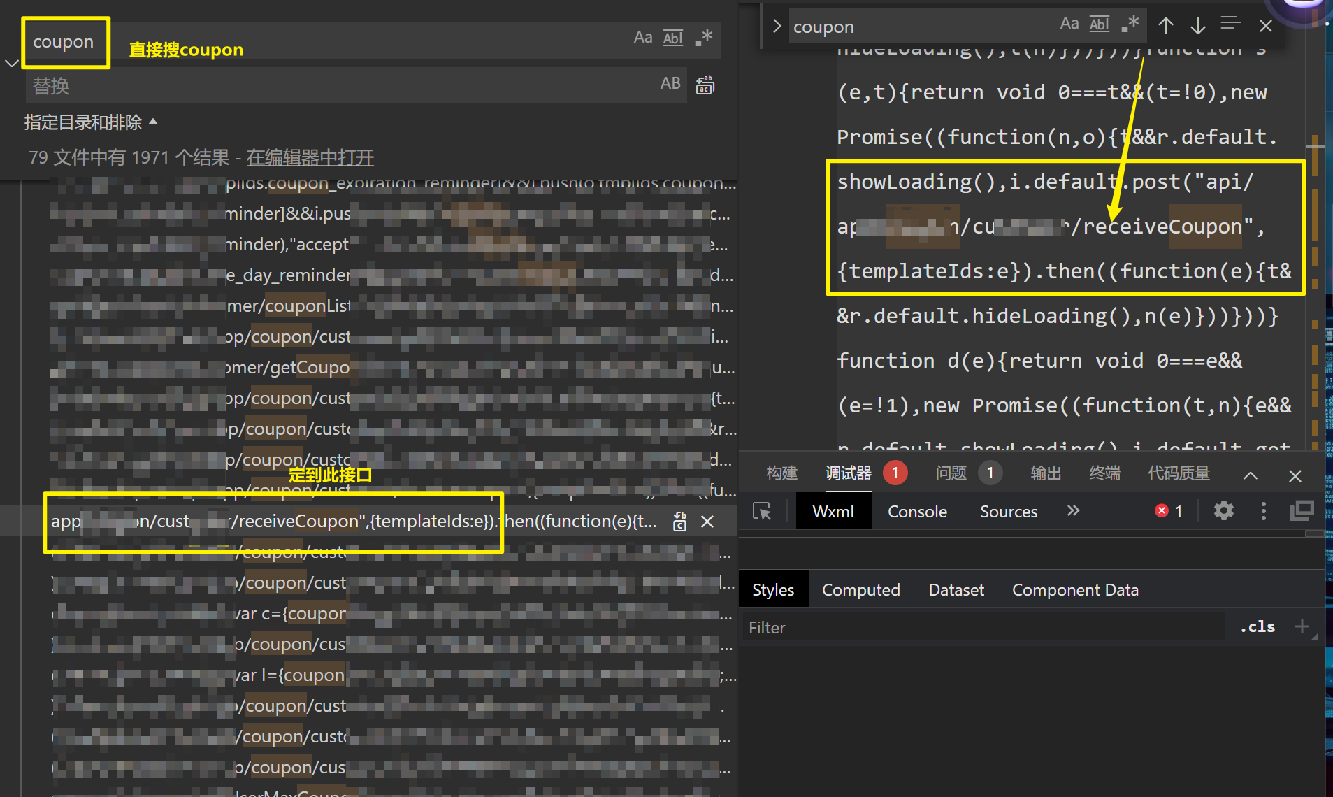 反编译文件直接用微信开发者工具打开,定位到包含coupon参数的接口,大家对下面接口敏感不:1、receiveCoupon接受优惠(大概率是个优惠券领取接口) 2、templateIds此参数可爆破